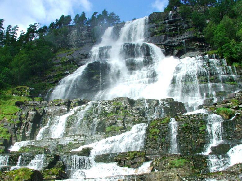 Vestlandet; Hier liggen de beroemde fjorden (oa het prachtige Geirangerfjord met zijn steile bergwanden die soms wel tot 1000 meter hoogte reiken, verder het Nordfjord, het Sognefjord en de Hardangerfjord) en de met sneeuw bedekte bergen. Hier vinden we naast hooggebergte ook uitgestrekte bossen en meren.De belangrijkste plaatsen zijn Bergen, Kristiansand, Stavanger Sørland en Telemark.